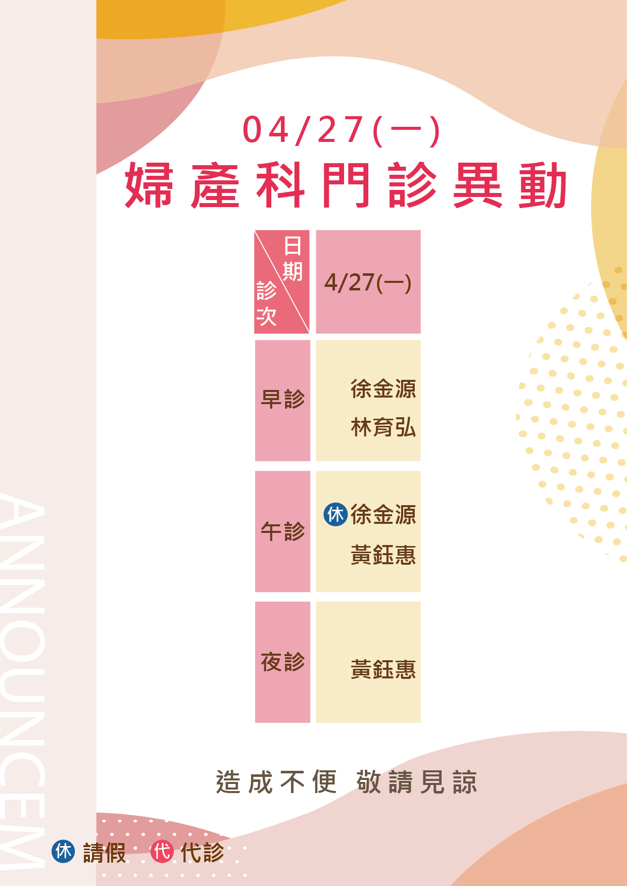 4/27(一)婦產科門診異動